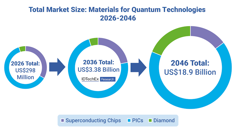 Quantum technologies, which encompasses the markets for quantum computing, quantum sensing, and quantum communications, is currently one of the fastest growing deep-tech industries. However, the performance and commercial viability of these cutting-edge technologies are often held back by material defects, bulky components, or poor manufacturing scalability. The newly released IDTechEx report "Materials for Quantum Technologies 2026-2046: Market, Trends, Players, Forecasts" analyzes the opportunities and emerging solutions in materials, components, and fabrication processes for the quantum industry, with 20-year forecasts informed by primary information from more than 30 company profiles. The total market opportunity for superconducting chips, PICs, and diamond for quantum technologies is anticipated to reach US$3.38 billion by 2036 and US$18.9 billion by 2046 with a total CAGR of 23.1% over the full forecast period.