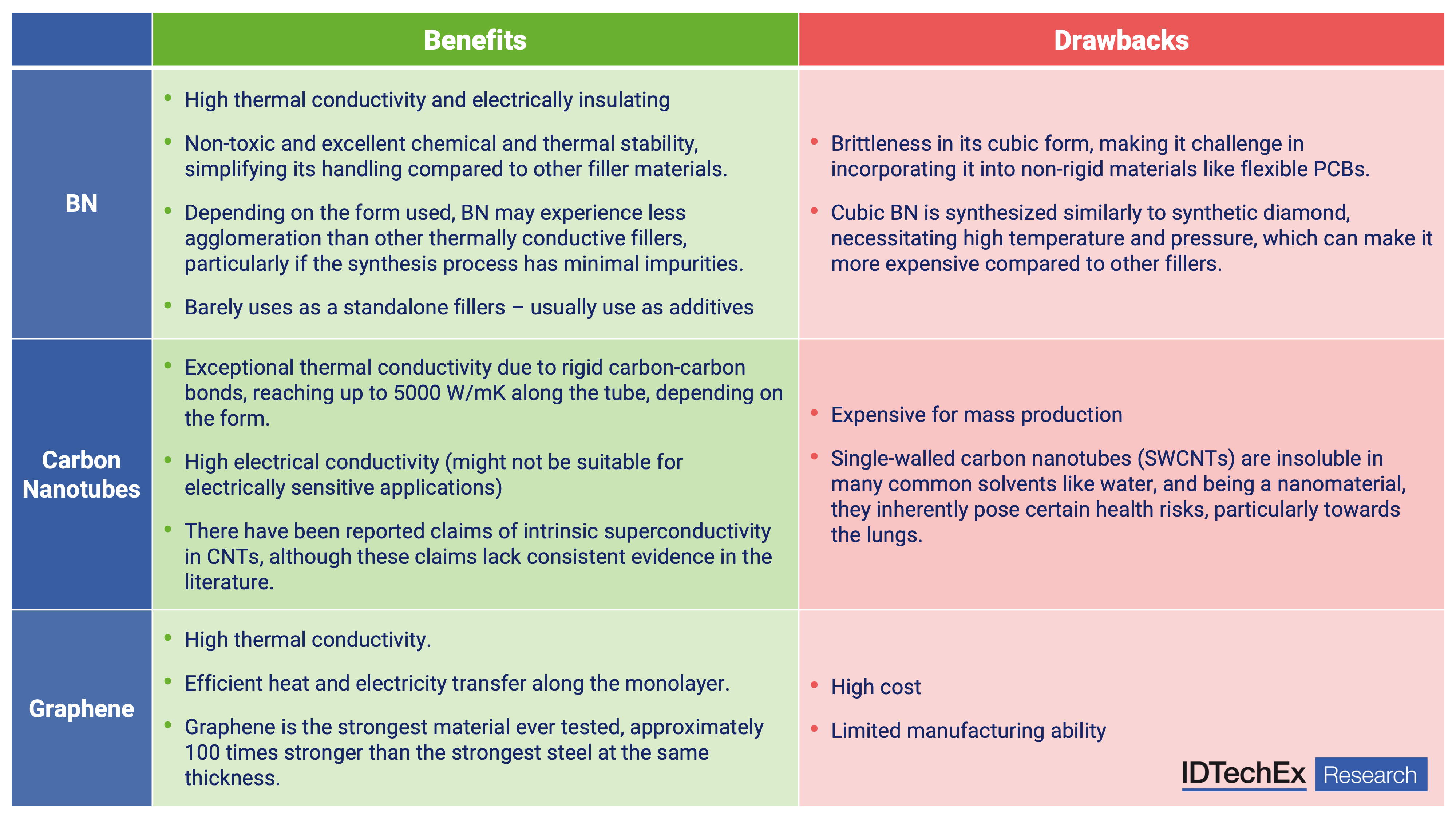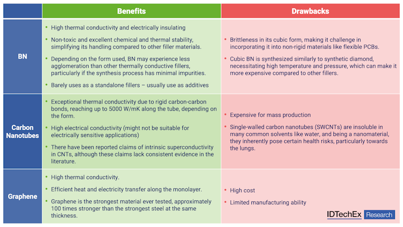 However, the primary barrier to the widespread adoption of BN fillers is their high cost. BN fillers typically range from US$50/kg to US$65/kg, influenced by factors such as volume, supplier, purity, and form. These costs are considerably higher compared to other fillers, leading to their use as secondary rather than primary fillers in many applications. This economic constraint means that BN is often incorporated in smaller quantities to achieve the desired thermal conductivity improvements without significantly increasing the overall cost of the material. A more detailed comparison of BN's thermal conductivity, density, dielectric strength, and use cases is in "Thermal Interface Materials 2026-2036: Technologies, Markets and Forecasts".